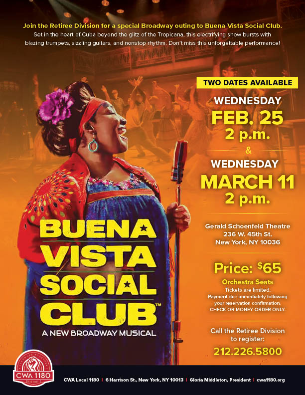 Buena Vista Social Club on Broadway $65/person | Gerald Schoenfeld Theatre Call the Retiree Division to reserve your spot today: 212.226.5800 | |